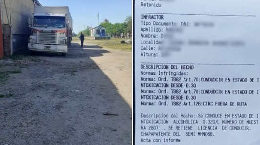 El test dio resultado positivo con 0,32g/l. Se trata de un hombre oriundo de la provincia de Bueno Aires al que se le retuvo la licencia de conducir y el camión se trasladó a Base 1 de la Secretaría en la Estación Belgrano.