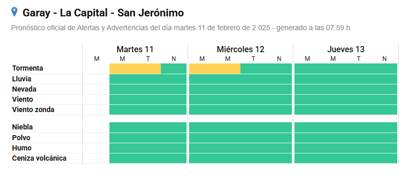 La Dirección de Gestión de Riesgo del municipio informa que rige un alerta amarilla del SMN por tormentas para la mañana y tarde de este martes y madrugada y mañana del miércoles.