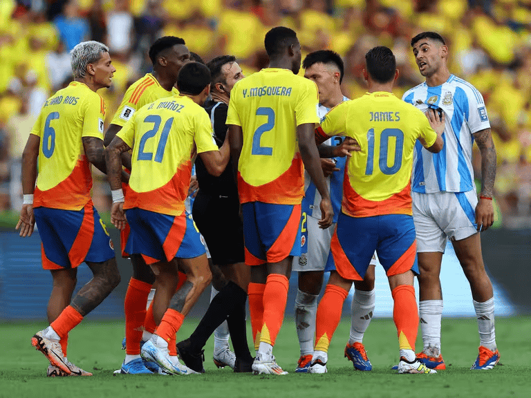 Argentina cayó en Barranquilla y Colombia disfrutó de su revancha de la final de la Copa América de Estados Unidos. El combinado cafetero se impuso por 2 a 1 gracias a los goles de Yerson Mosquera y James Rodríguez, de penal. Nico González había empatado transitoriamente para La Scaloneta. De todos modos, el combinado albiceleste se mantiene en la cima de la tabla de posiciones con 18 unidades. Los de Néstor Lorenzo, en tanto, mantuvieron su invicto en la competición y ocupan el segundo puesto con 16 unidades. El elenco criollo dejó en el camino una racha de 12 presentaciones sin conocer la derrota.