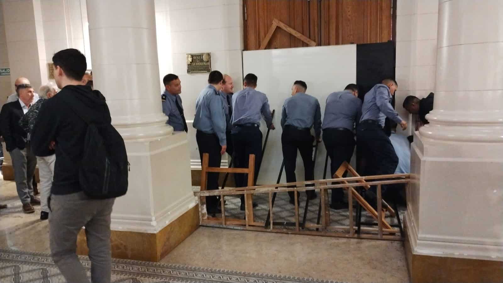 Ante la insistencia de los manifestantes, las puertas no resistieron y fueron derribadas, lo que permitió el ingreso de un número indeterminado de personas al interior de la Legislatura. Los incidentes generaron momentos de gran conmoción y obligaron a los diputados a interrumpir la sesión y a resguardarse en sus despachos.