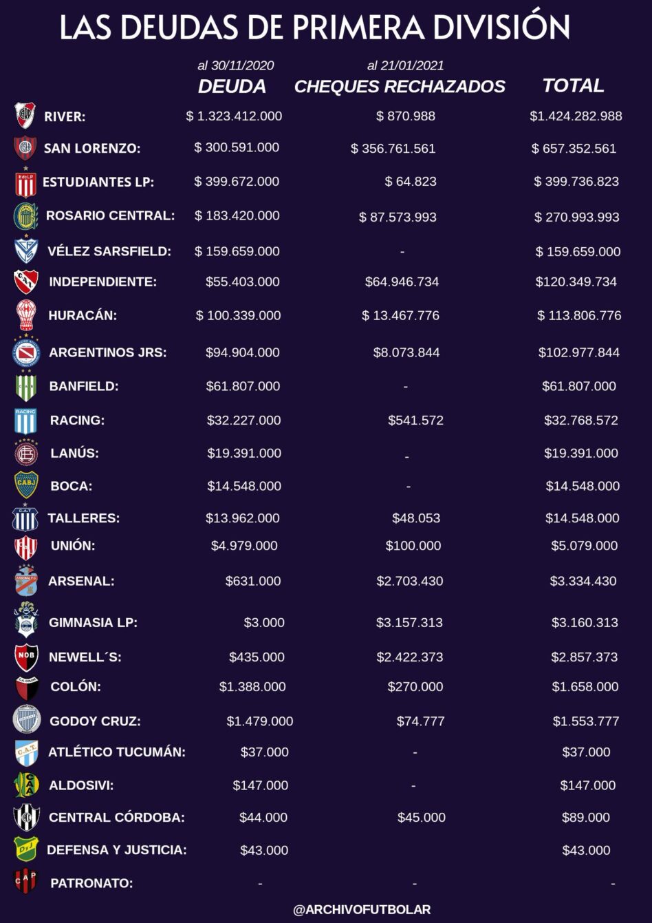 Del otro lado de la tabla, Central Córdoba apenas tiene $89 mil de deuda, Defensa y Justicia $43 mil y Patronato no registra nada en el debe.