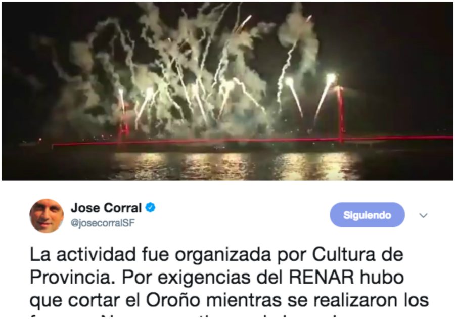 Surgió tras una crítica que hicieron en Twitter y donde lo nombraron como si fuese el responsable. Ante esa acusación se defendió: “La actividad fue organizada por Cultura de Provincia. Por exigencias del RENAR hubo que cortar el Oroño mientras se realizaron los fuegos”. Y agregó: “No compartimos el show de estruendo, hay fuegos mucho menos ruidosos que deberían haberse utilizado. Los exigiremos para la próxima”.
