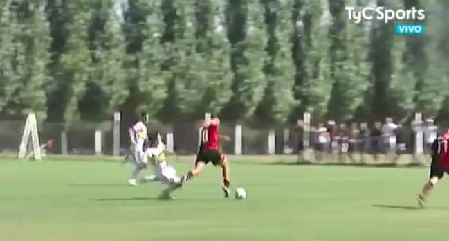 El jugador del rojinegro había recuperado la pelota y se disponía a encarar hacia el arco de la visita cuando sintió un fuerte golpe de atrás. El del Boca se tiró sin compasión y le pegó a la altura de la rodilla: ni esperó a que el árbitro lo expulsara, se levantó y se fue solo.