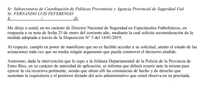 Sin embargo la respuesta no fue la esperada. Guillermo Madero, Director Nacional de Seguridad en Espectáculos Futbolísticos, desestimó el pedido y los 137 hinchas se seguirán quedando sin ir a la cancha cuando el Sabalero juegue de local.