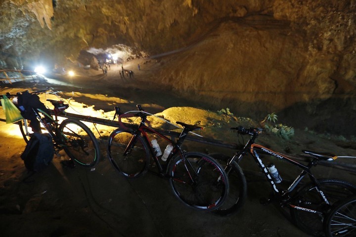 Submarinistas del ejército tailandés sondeaban el fondo de la cueva, donde el agua alcanzó en algunos partes hasta cinco metros de altura debido a las fuertes lluvias del monzón de los últimos días.