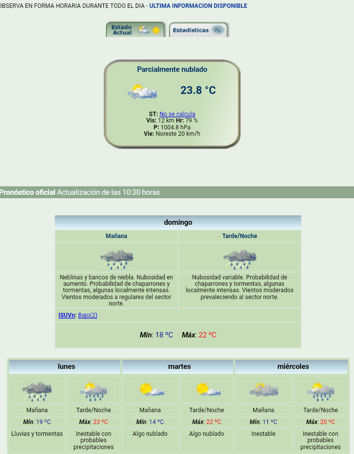 El pronóstico anuncia nubosidad variable con probabilidad de chaparrones, tormentas, algunas localmente intensas y vientos moderados prevaleciendo al sector norte, con una temperatura mínima de 18°C y una máxima de 22°C.