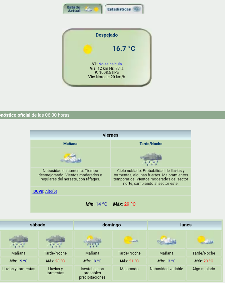 Para la jornada de hoy se espera nubosidad en aumento, vientos moderados del noreste, y probabilidades de lluvias y tormentas para la tarde/noche.