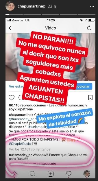 Por ejemplo, la agencia de viajes Turismocity, desafió al joven a juntar 2000 comentarios diciendo “@turismocity_ar #ChapiARusia”. Si lo lograba, viajaría con todo pago a la Copa del Mundo… y así fue.