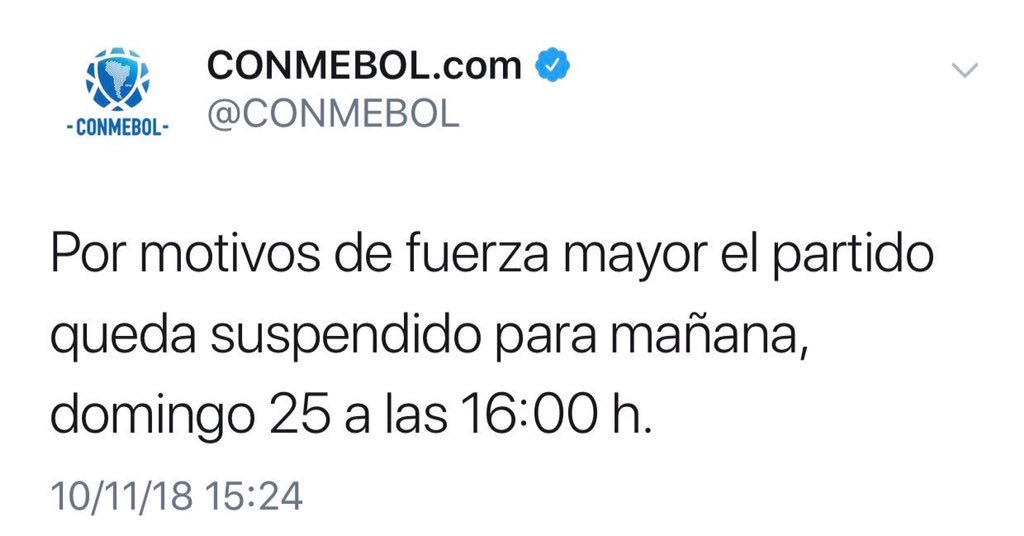 Por eso, la Conmebol decidió suspenderlo. Pero al anunciarlo cometieron un error. “Por motivos de fuerza mayor el partido queda suspendido para mañana, domingo 25 de noviembre a las 16:00 horas”, anunciaron en su Twitter.
