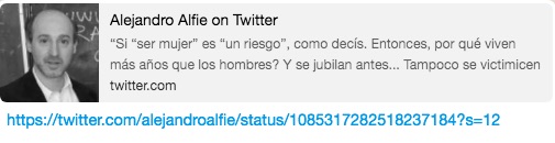 Por eso Alfie eliminó el mensaje y ante el mensaje de un usuario pidió disculpas. “Te cuento que acaban de matar a una mujer a martillazos en Gobernador Gálvez. Fue su esposo. A las mujeres nos matan por ser mujeres. Te cambio jubilarnos más tarde si no nos matan”, le escribió @AnaCorrea.