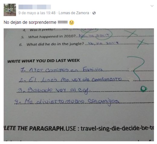 Sucedió en Bandield, donde una profesora de inglés subió a su cuenta privada de Facebook la foto de un examen con la frase “No dejan de sorprenderme”, en alusión a las contestaciones en español de una alumna.