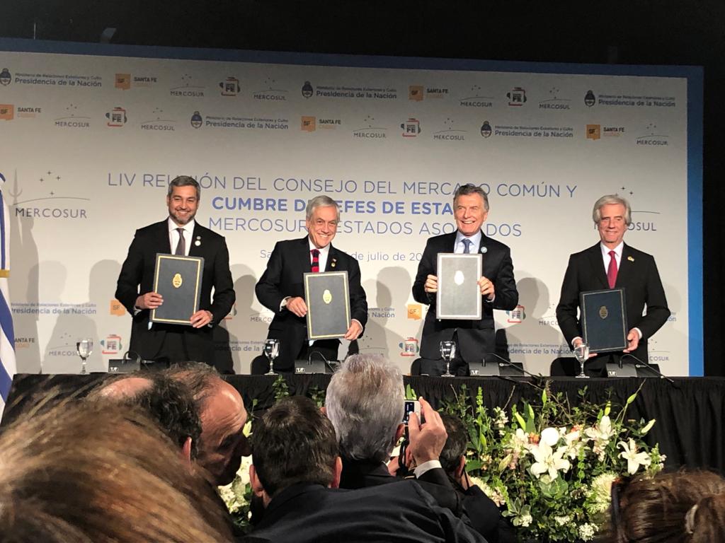 Apenas habían pasado unos minutos de las 14 cuando los presidentes de Argentina, Paraguay, Uruguay y Chile ingresaron a la sala de conferencias. No hubo discursos, ni charlas. Apenas una firma y una arenga de Mauricio Macri.