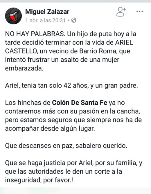 Ariel era fanático de Colón, por eso uno de sus amigos lo despidió con una foto en el Cementerio de los Elefantes, en la que cargaba a su hijo. “Los hinchas de Colón ya no contaremos más con su pasión en la cancha, pero estamos seguros que siempre nos ha de acompañar desde algún lugar”, le escribió Miguel Zalazar. “No hay palabras, un hijo de p… hoy a la tarde decidió terminar con la vida de Ariel, un vecino de Barrio Roma”, había comenzado su mensaje. Y luego terminó: “Que descanses en paz, sabalero querido. Que se haga justicia por Ariel, por su familia y que las autoridades le den un corte a la inseguridad por favor”.