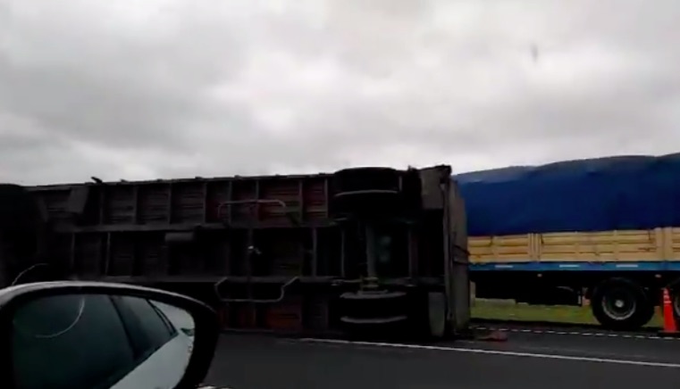 Por los fuertes vientos, un camión perdió el control de su acoplado que se tumbó en la autopista Rosario – Buenos Aires, en el mediodía de este miércoles.