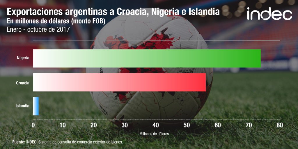 Al que más bienes le vendió el país entre enero y octubre del 2017 fue a Nigeria. Seguido de cerca por Croacia. Muy por debajo de estos dos rivales de la Selección en Rusia 2018 viene Islandia: claro, el país del noroeste de Europa tiene apenas 340 mil habitantes… menos que la ciudad de Santa Fe.