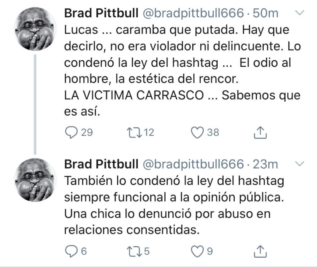 Y continuó el músico: “Lucas… caramba, qué putada. Hay que decirlo, no era violador ni delincuente. Lo condenó la ley del hashtag… El odio al hombre, la estética del rencor. LA VíCTIMA CARRASCO… Sabemos que es así”.