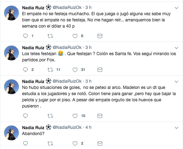 Sobre el partido, la hermana del enganche que fue muy criticado por la cantidad de pelotas que perdió en la mitad de la cancha, escribió en su cuenta de Twitter: “No hubo situaciones de goles, no se peteó al arco. Madelon es un DT que estudia a los jugadores y se notó. Colón tiene para ganar, pero hay que bajar la pelota y jugar por el piso. A pesar del empate orgullo de los huevos que pusieron”.