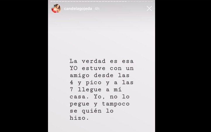 Sin embargo, Cande Ojeda (@candelagojeda) aseguró que ella no fue quien la lastimó. “La gran influencer anduvo a las patadas y ahora se hace la víctima. Lástima das Estefanía”, comenzó en su descargo. Pero luego explicó: “Yo estuve con un amigo desde las 4 hasta las 7. Yo no le pegué ni sé quién lo hizo”.