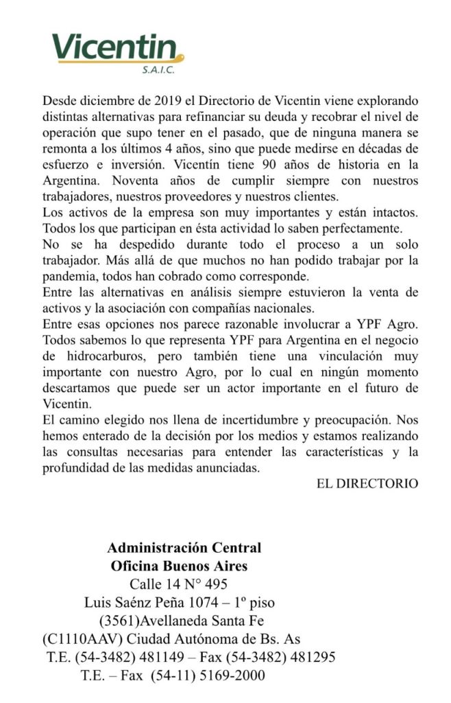 “Desde diciembre de 2019, el Directorio de Vicentin viene explorando distintas alternativas para refinanciar su deuda y recobrar el nivel de operación que supo tener en el pasado, que de ninguna manera se remonta a los últimos 4 años, sino que puede medirse en décadas de esfuerzo e inversión. Vicentin tiene 90 años de historia en la Argentina. Noventa años de cumplir siempre con nuestros trabajadores, proveedores y nuestros clientes” comienza el comunicado de tan solo unas pocas líneas.