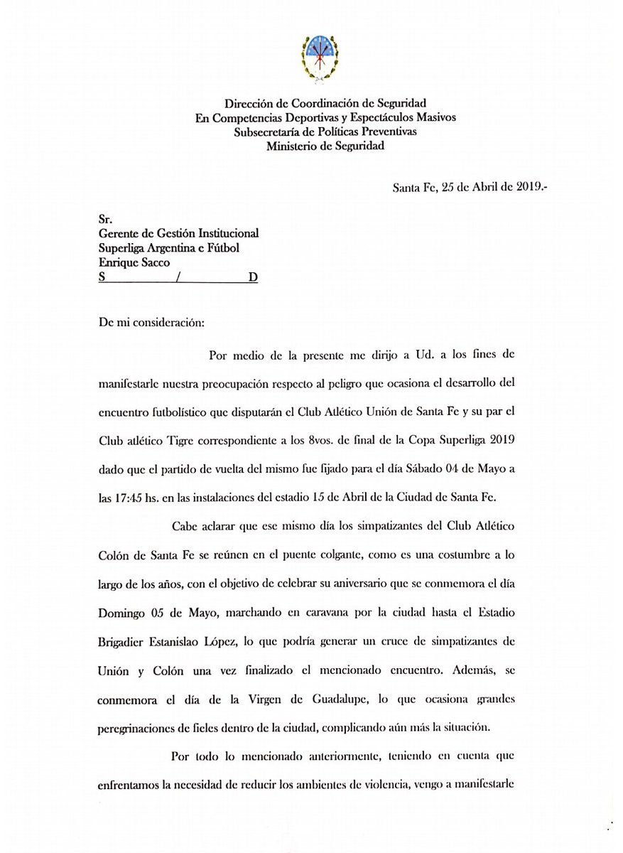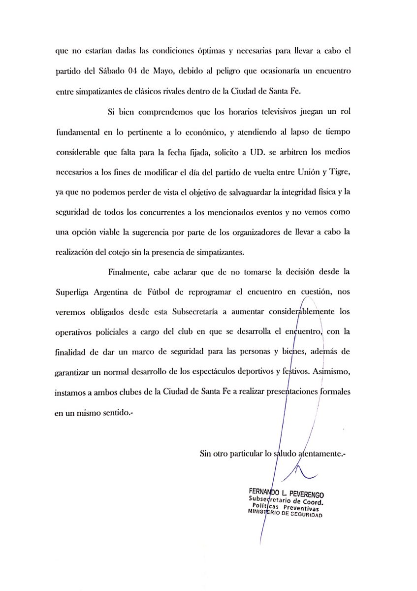 El Tate jugaría el 4 de mayo a las 17.45, pero lo complicado sería el horario de salida del 15 de abril, cuando habrá hinchas de Colón en el Boulevard, sobre la zona de la Costanera. La proximidad de ambas hinchadas podría acarrear “peligros”, según lo describe la misiva enviada por el Ministerio de Seguridad Provincial. “No están dadas las condiciones óptimas y necesarias para llevar a cabo el partido”, dice el texto que firma Fernando Peverengo. Para el funcionario, la única forma de que se realicen ambos eventos, es que los clubes se hagan cargo de aumentar considerablemente la seguridad. Y aún así no es lo que preferiría hacer.