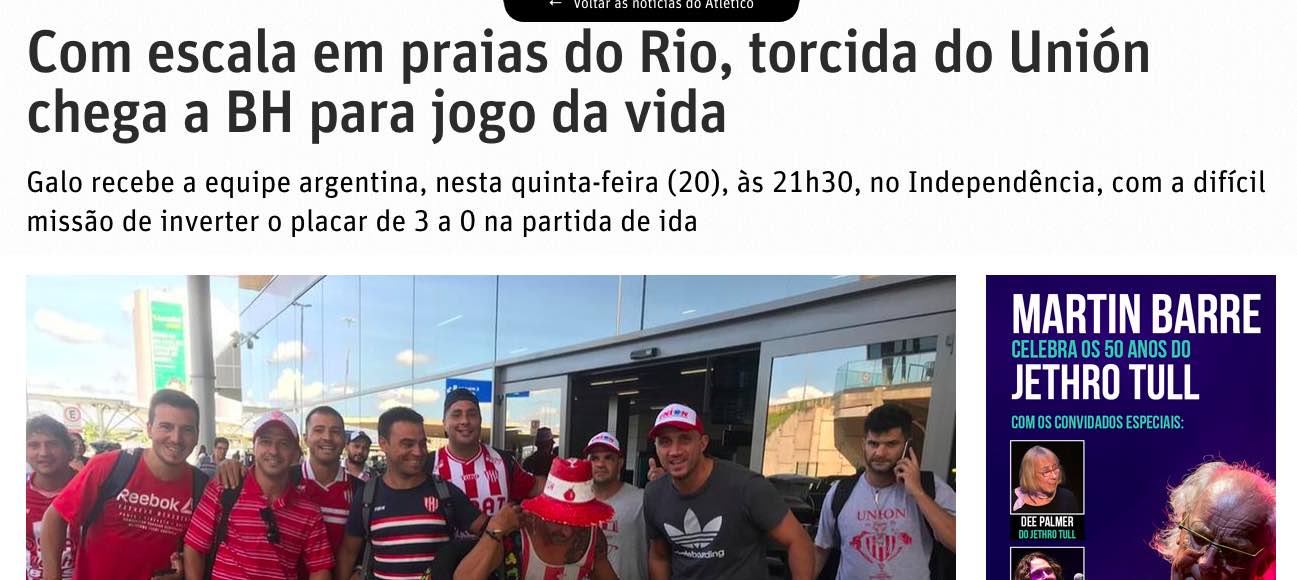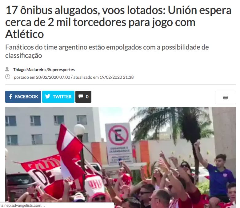“17 autobuses alquilados, vuelos llenos de gente: Unión espera que cerca de 2 mil fanáticos para el juego con el Atlético”, así titula un artículo sobre los “torcedores” del Tate el medio Super Esportes de Belo Horizonte.