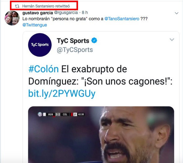 Un hincha de Unión provocó en su cuenta de Twitter: “Lo nombrarán “persona no grata” como a @TanoSantarsiero?”. Y el relator aprovechó el mensaje: lo replicó y de esa manera expuso su pensamiento. ¿Atacarán tan duro al entrenador de Colón como a él por haber explotado contra el equipo? Santarsiero no se baja de la polémica.