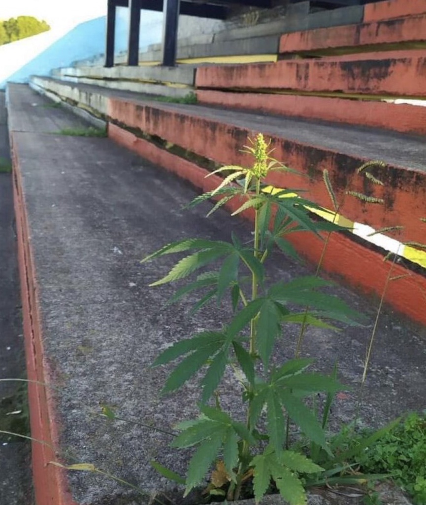 En las tribunas de clemente de Brown de Adrogué de Buenos Aires creció una planta de marihuana. Los empleados del club se encontraron con este hallazgo cuando realizaban algunas tareas. Nadie se explica cómo pudo haber crecido allí.