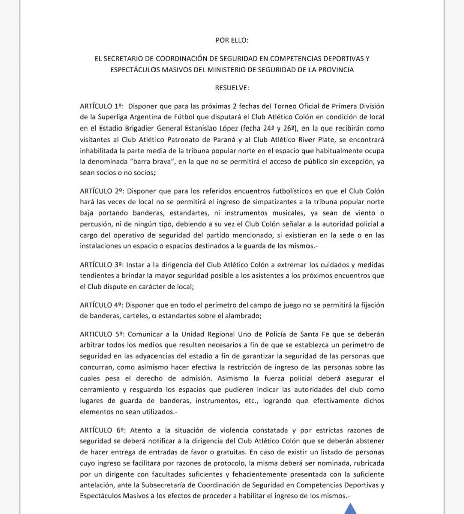 En el comunicado difundido enumera una serie de medidas, entre las que se destacan que “para las próximas 2 fechas del torneo oficial de primera división de la Superliga argentina de fútbol que disputará el Club Atlético Colón en condición de local en el Estadio Brigadier General Estanislao López (fecha 24 y 26) en la que recibirán como locales a Club Atlético Patronato de Paraná y al Club Atlético River Plate, se encontrará inhabilitada la parte media de la tribuna popular norte en el espacio que habitualmente ocupa la denominada “barra brava”, en la que no se permitirá el acceso de público sin excepción, ya sean socios o no socios”.