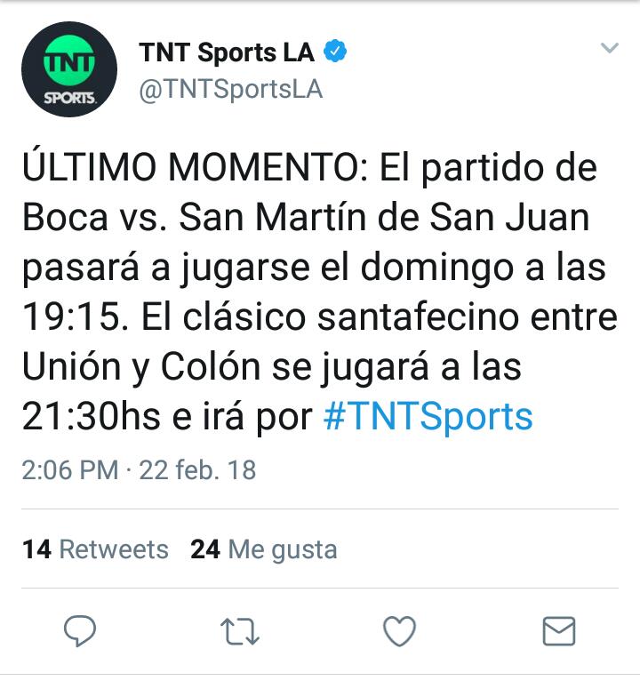 Más tarde, el twitter de TNT Sports fue borrado. El Comité de Seguridad no autorizó que el juego del Xeneize ante San Martín de San Juan se adelante dos horas y cuarto. Ante esto, el derby de la ciudad comenzará a la hora estipulada.