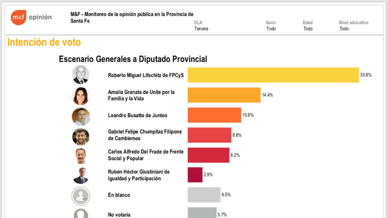 Mientras hay un final abierto en la elección a gobernador, donde Omar Perotti estaría aventajando por 4 o 5 puntos a Antonio Bonfatti; la categoría a diputados estaría más definida. Miguel Lifschitz se quedaría con el 33,8% de los votos, más del doble del segundo. Pero extrañamente, quien lo secunda no sería el justicialismo. Según la encuesta de la consultora Management & Fit de fines de mayo, Amalia Granata sumaría 14,6% de los sufragios, cuatro puntos arriba de Leandro Busatto del frente Juntos.