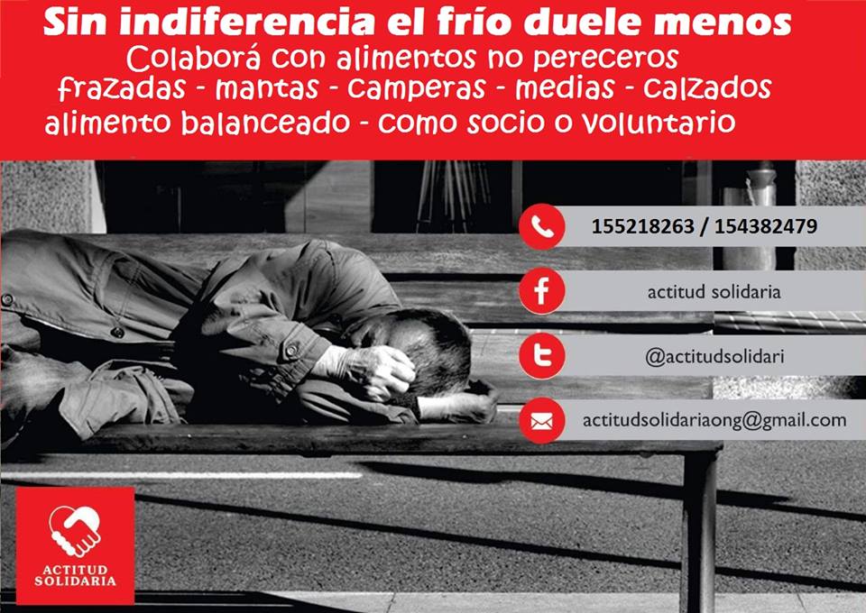 Algunas entidades solidarias se encargan de brindar asistencia a través de hogares para dormir, así como colectas de abrigos, alimentos, frazadas, etc. Las ONG realizan un trabajo admirable y para hacer mas efectiva su labor hacen circular cadenas donde detallan como comunicarte con ellos, si sabes de personas en situación de calle o tenes algo para aportar a la causa.