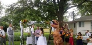 ¡Única! Fue al casamiento de su hermana vestida de dinosaurio