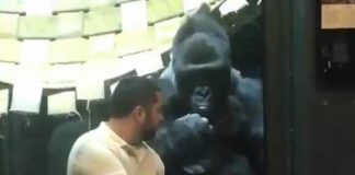 El gorila parece pedir al hombre que vaya pasando las fotografías, para lo que golpea el cristal cada poco tiempo.