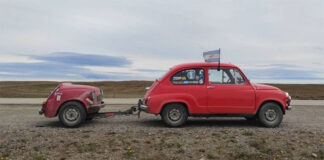 Una pareja de Tucumán recorre el país en un Fiat 600, al que le agregaron un tráiler armado con medio fitito, en el que llevan desde la carpa hasta bidones con nafta.
