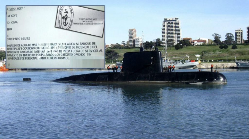 El submarino argentino ARA “San Juan”, que permanece desaparecido desde el 15 de noviembre en el Atlántico Sur con 44 tripulantes a bordo, reportó en su última comunicación un “principio de incendio” en un sector donde están alojadas las baterías que lo alimentan de energía.