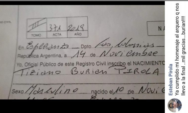 Según le contó Esteban Pirola, de 33 años a la radio Cadena 3, estaba en Paraguay cuando se enteró que su bebé estaba por nacer. “A pesar que no salió campeón, tenía la convicción de que se llame Tiziano Burián Pirola”, dijo.
