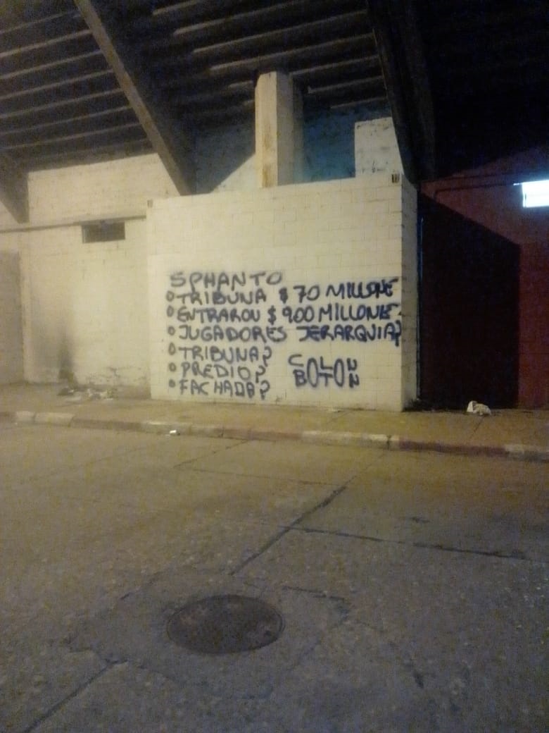 En este caso se encontraron pintadas pero no con las habituales insultos que rodean al mal momento de un equipo. En este caso hacen referencia a la conducción de Luis Spahn: “Sphanto“, el juego de palabras para describir la gestión del presidente tatengue seguido de algunos números.