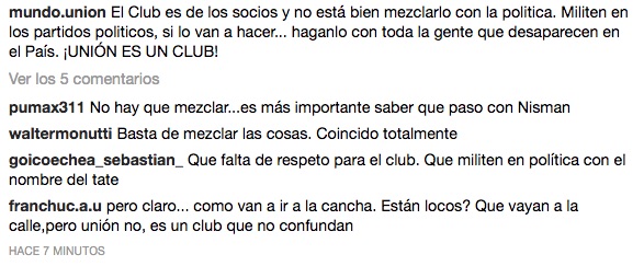 La página partidaria Mundo.Unión también tomó partido: “El Club es de los socios y no está bien mezclarlo con la politica. Militen en los partidos politicos, si lo van a hacer… háganlo con toda la gente que desaparecen en el País. ¡UNIÓN ES UN CLUB!”.