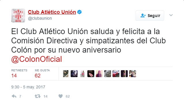 Por respeto entre ambos clubes, Unión dejó su mensaje en Twitter para Colón quien cumplió 112 años. Nuevamente el saludo llegó por Twitter. “El Club Atlético Unión saluda y felicita a la Comisión Directiva y simpatizantes del Club Colón por su nuevo aniversario @ColonOficial”